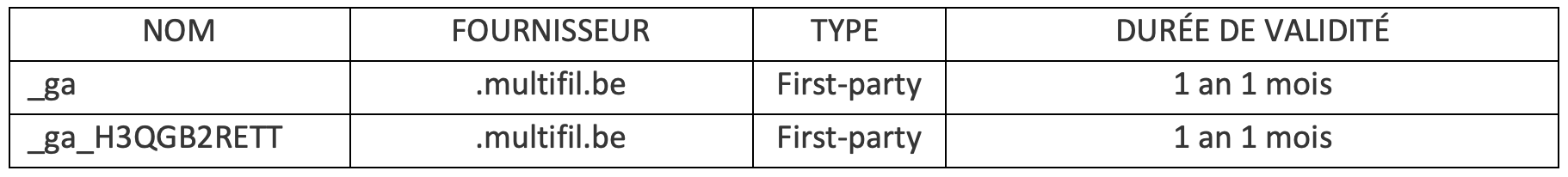 Outre les cookies nécessaires, Multifil utilise les cookies analytiques suivants :
